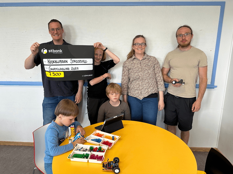 Bilde av medlemmer fra Stadsbygd Kodeklubb og pengene de fikk i forbindelse med Stadsbygd Sparebank sin gavetildeling 2025.